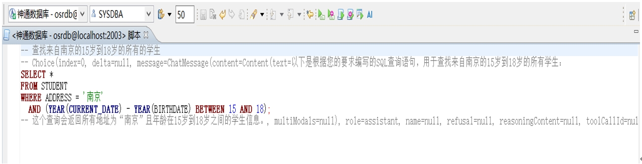 為進一步賦能企業高效利用數據資源,神通數據庫的DBStudio工具中引入了DeepSeek能力改寫了原有的AI智能補全功能,使用者能夠以對話的便捷方式,將自然語言無縫轉化為SQL及復雜查詢語句,這一功能徹底扭轉了以往數據庫交互依賴專業編碼的局面,升級為“全民對話”的模式,大大降低了企業數據驅動能力的技術門檻。